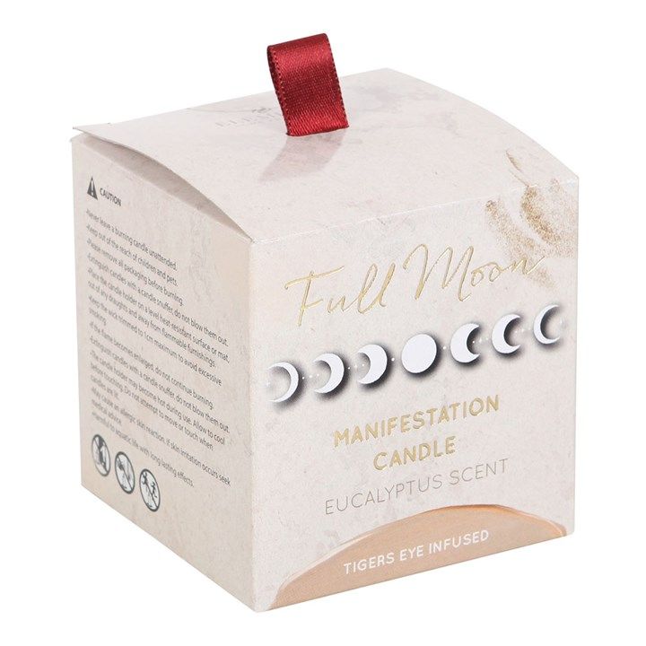 Manifesteer je dromen onder de volle maan met deze prachtige eucalyptus geurkaars. Een beige matglazen houder en een metalen deksel worden geaccentueerd door een verspreiding van tijgeroog kristalsteentjes die later voor verschillende spirituele en decoratieve doeleinden hergebruikt kunnen worden.